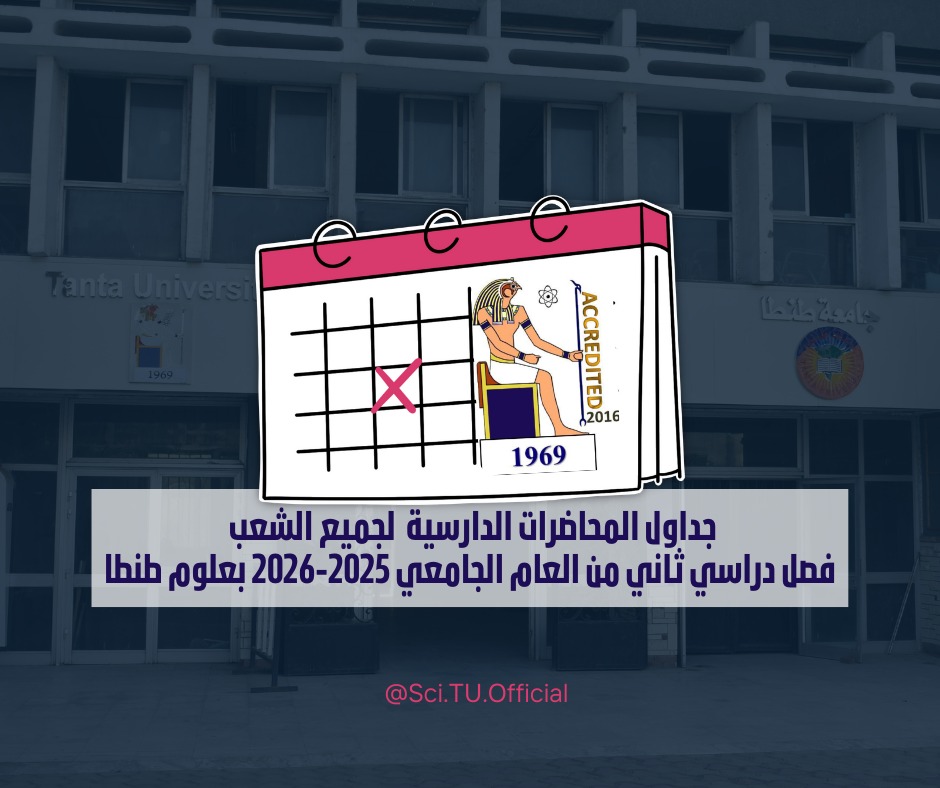 تعلن إدارة شئون التعليم والطلاب بكلية العلوم جامعة طنطا عن المحاضرات الدارسية لجميع الشعب بالفصل الدراسي الثاني من العام الجامعي 2025-2026.
