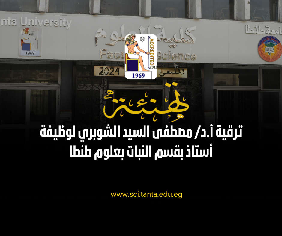 تتقدم السيدة الأستاذ الدكتور عبير عبدالحميد علم الدين عميد كلية العلوم جامعة طنطا نيابة عن أسرة الكلية بخالص التهاني القلبية للأستاذ الدكتور مصطفى السيد الشوبري الأستاذ المساعد بقسم النبات لترقية سيادته لوظيفة أستاذ بذات القسم، طبقاً لقرار مجلس جامعة طنطا في جلسته الأخيرة برئاسة الدكتور محمد حسين رئيس جامعة طنطا.
