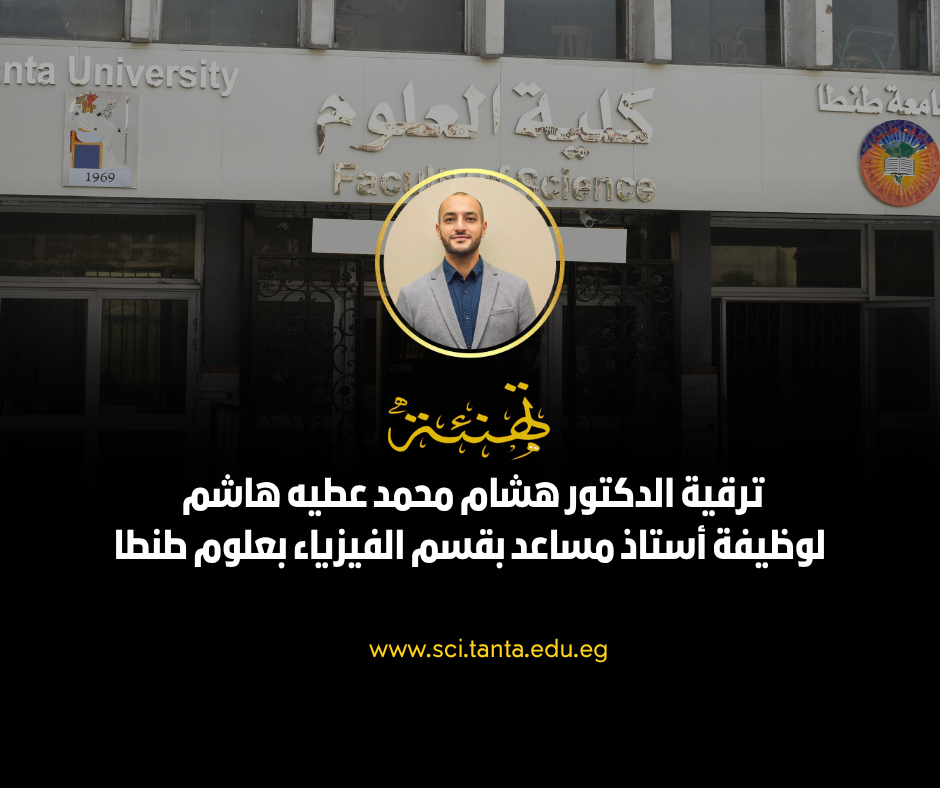 تتقدم السيدة الأستاذ الدكتور عبير عبدالحميد علم الدين عميد كلية العلوم جامعة طنطا نيابة عن أسرة الكلية بخالص التهاني القلبية للدكتور هشام محمد عطيه هاشم المدرس بقسم الفيزياء لترقية سيادته لوظيفة أستاذ مساعد بذات القسم، طبقاً لقرار مجلس جامعة طنطا في جلسته الأخيرة برئاسة الدكتور محمد حسين رئيس جامعة طنطا.