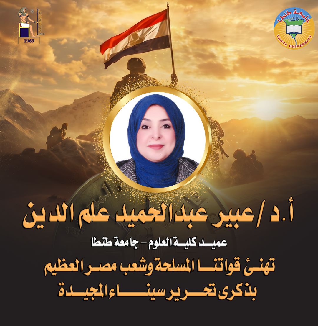 تتقدم الأستاذة الدكتورة عبير عبدالحميد علم الدين عميد كلية العلوم جامعة طنطا نيابة عن أسرة كلية العلوم جامعة طنطا، بخالص التهنئة القلبية إلي شعب مصر العظيم وإلي قواتنا المسلحة الباسلة وقائدها الأعلى السيد الرئيس عبدالفتاح السيسي رئيس الجمهورية، والفريق أشرف سالم وزير الدفاع والإنتاج الحربي،