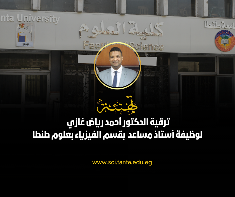 تتقدم السيدة الأستاذ الدكتور عبير عبدالحميد علم الدين عميد كلية العلوم جامعة طنطا نيابة عن أسرة الكلية بخالص التهاني القلبية للدكتور أحمد رياض غازي المدرس بقسم الفيزياء لترقية سيادته لوظيفة أستاذ مساعد بذات القسم، طبقاً لقرار مجلس جامعة طنطا في جلسته الأخيرة برئاسة الدكتور محمد حسين رئيس جامعة طنطا.