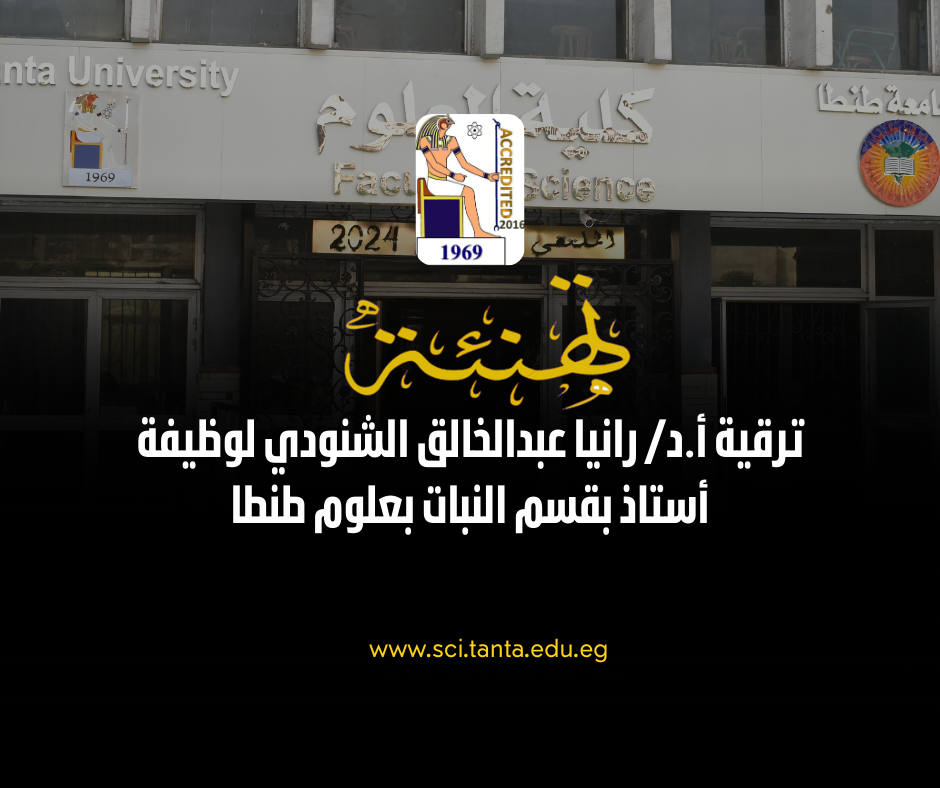 تتقدم السيدة الأستاذ الدكتور عبير عبدالحميد علم الدين عميد كلية العلوم جامعة طنطا نيابة عن أسرة الكلية بخالص التهاني القلبية للأستاذ الدكتور مصطفى السيد الشوبري الأستاذ المساعد بقسم النبات لترقية سيادته لوظيفة أستاذ بذات القسم،