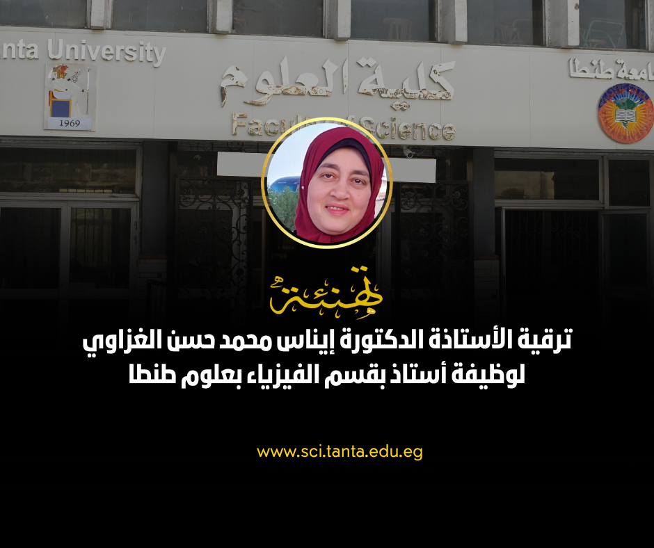 تتقدم السيدة الأستاذ الدكتور عبير عبدالحميد علم الدين عميد كلية العلوم جامعة طنطا نيابة عن أسرة الكلية بخالص التهاني القلبية للأستاذة الدكتورة إيناس محمد حسن الغزاويالأستاذ المساعد بقسم الفيزياء لترقية سيادتها لوظيفة أستاذ بذات القسم، طبقاً لقرار مجلس جامعة طنطا في جلسته الأخيرة برئاسة الدكتور محمد حسين رئيس جامعة طنطا.
