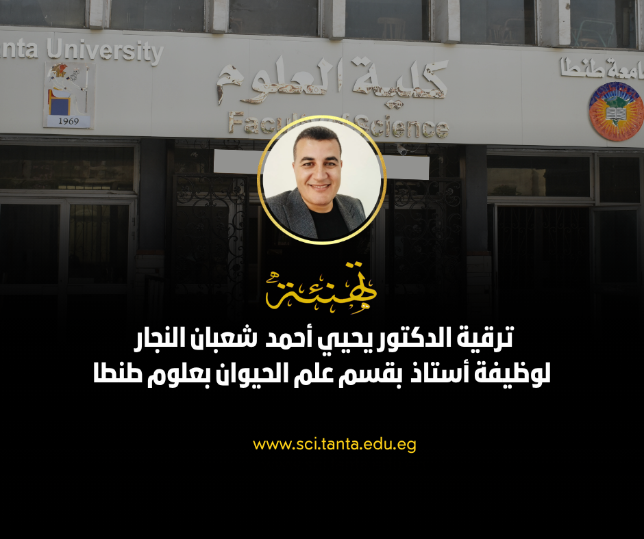 تتقدم السيدة الأستاذ الدكتور عبير عبدالحميد علم الدين عميد كلية العلوم جامعة طنطا نيابة عن أسرة الكلية بخالص التهاني القلبية للدكتور يحيي أحمد شعبان النجار الأستاذ المساعد بقسم علم الحيوان لترقية سيادته لوظيفة أستاذ بذات القسم، طبقاً لقرار مجلس جامعة طنطا في جلسته الأخيرة برئاسة الدكتور محمد حسين رئيس جامعة طنطا.