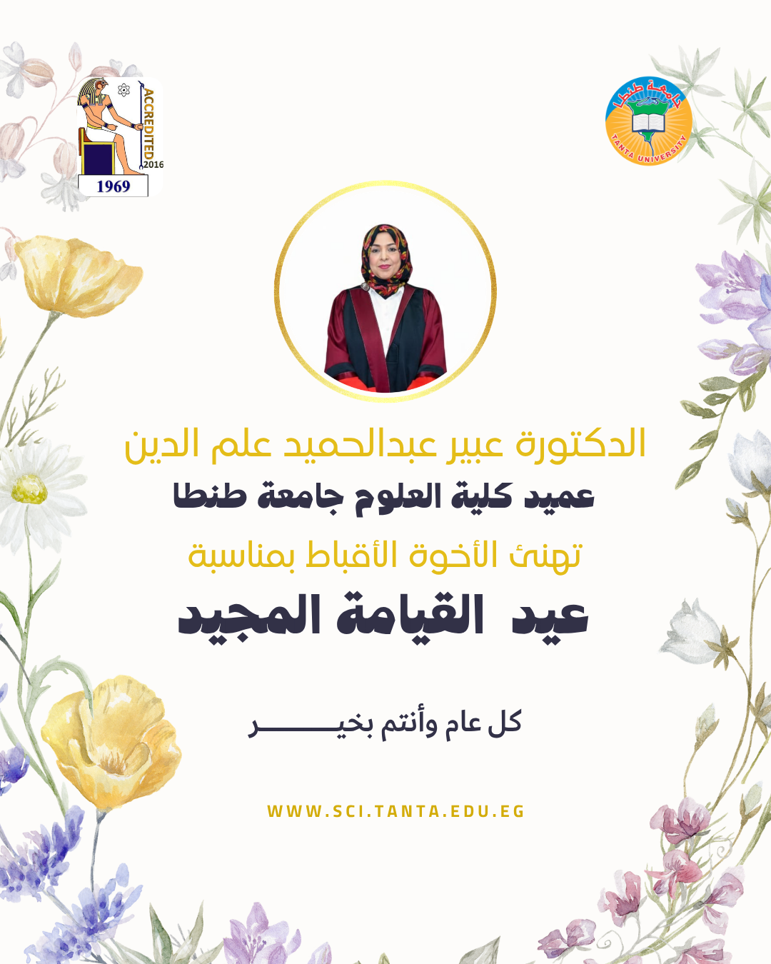 تتقدم الدكتورة عبير عبدالحميد علم الدين، عميد كلية العلوم جامعة طنطا، بخالص التهاني القلبية وأطيب الأمنيات إلى الأخوة الأقباط من السادة أعضاء هيئة التدريس، والهيئة المعاونة، والعاملين، والأمن الإداري، وأبنائها الطلاب، وذلك بمناسبة عيد القيامة المجيد.