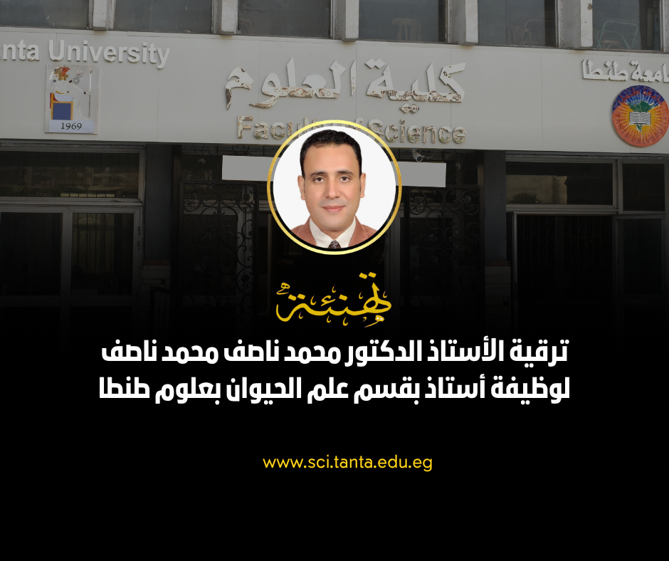 تتقدم السيدة الأستاذ الدكتور عبير عبدالحميد علم الدين عميد كلية العلوم جامعة طنطا نيابة عن أسرة الكلية بخالص التهاني القلبية للأستاذ الدكتور محمد ناصف محمد ناصف الأستاذ المساعد بقسم علم الحيوان لترقية سيادته لوظيفة أستاذ بذات القسم، طبقاً لقرار مجلس جامعة طنطا في جلسته الأخيرة برئاسة الدكتور محمد حسين رئيس جامعة طنطا.