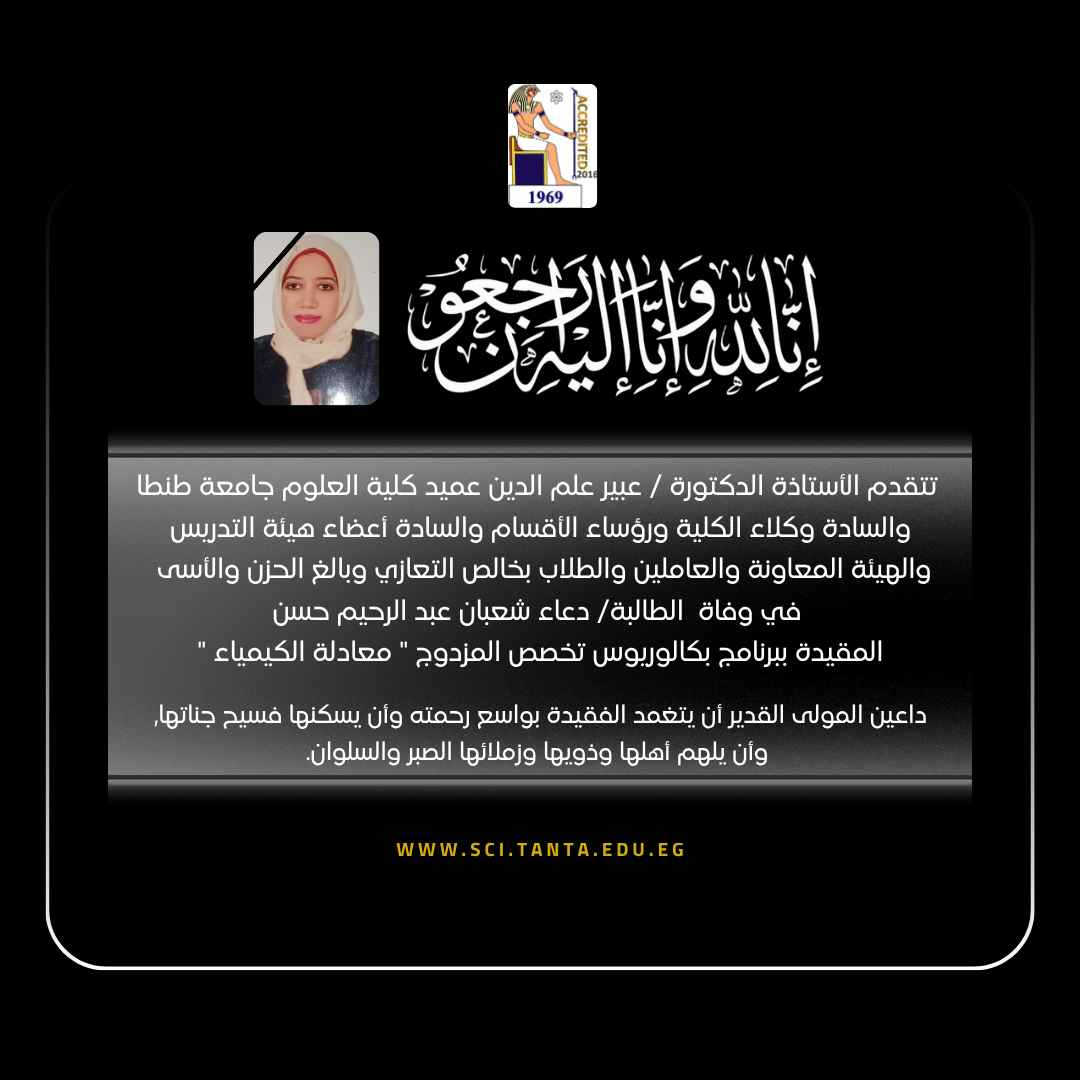 تتقدم الأستاذة الدكتورة عبير علم الدين، عميد كلية العلوم جامعة طنطا، والسادة الوكلاء، وأعضاء هيئة التدريس، والهيئة المعاونة، وجميع العاملين، والأمن الاداري، والطلاب بالكلية، بخالص التعازي في وفاة شقيقة الأستاذ الدكتور عادل سليم الأستاذ المتفرغ بقسم الكيمياء بالكلية.