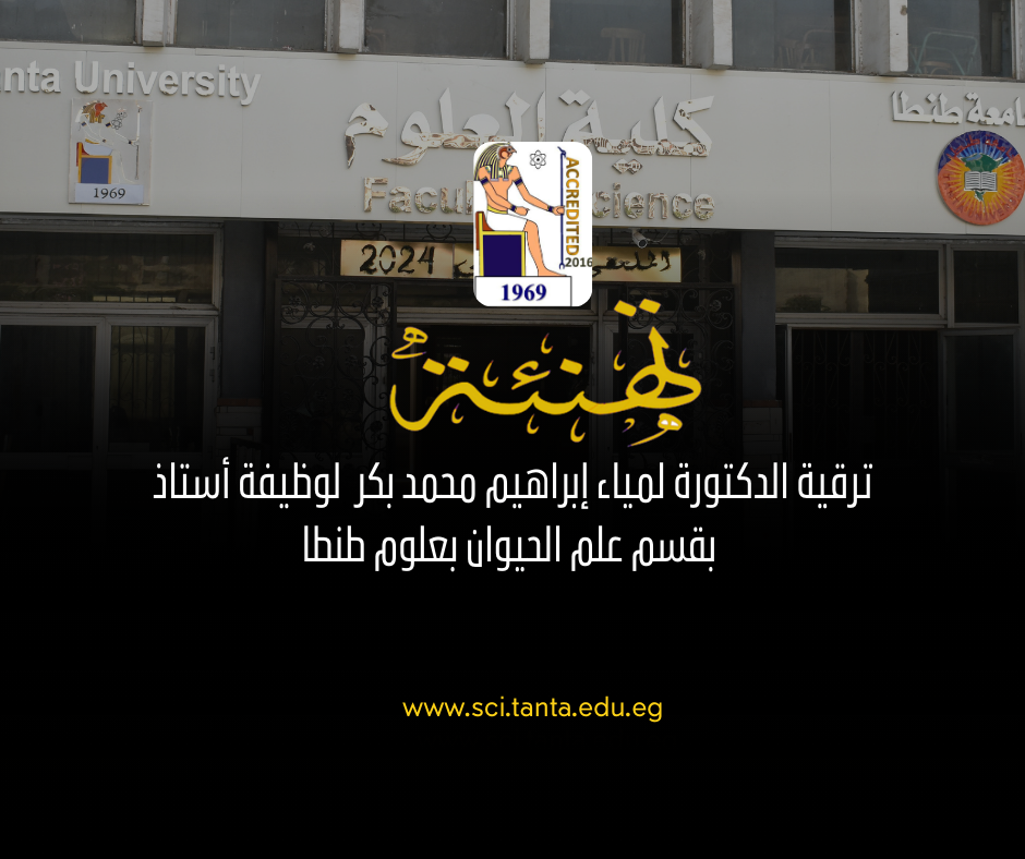 تتقدم السيدة الأستاذ الدكتور عبير عبدالحميد علم الدين عميد كلية العلوم جامعة طنطا نيابة عن أسرة الكلية بخالص التهاني القلبية للأستاذة الدكتورة لمياء إبراهيم محمد بكر الاستاذ المساعد بقسم علم الحيوان إلي لترقية سيادتها لوظيفة أستاذ بذات القسم